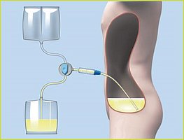 Nach Durchführung der Hygienemassnahmen schliessen Sie das CAPD-Set an Ihren Katheter an. Das CAPD-Set besteht in der Regel aus zwei Beuteln, einem leeren Abfallbeutel und einem Beutel, der mit 2–2,5 Litern Reinigungsflüssigkeit oder Dialysat gefüllt ist. Sie entleeren die gebrauchte Dialyselösung durch Ihren Katheter. Dies dauert etwa 20 Minuten. Nach dem Abfliessen der verbrauchten Lösung erfolgt das Spülen des Schlauchsystems („Flush“) mit einer kleinen Menge frischer Dialyselösung.