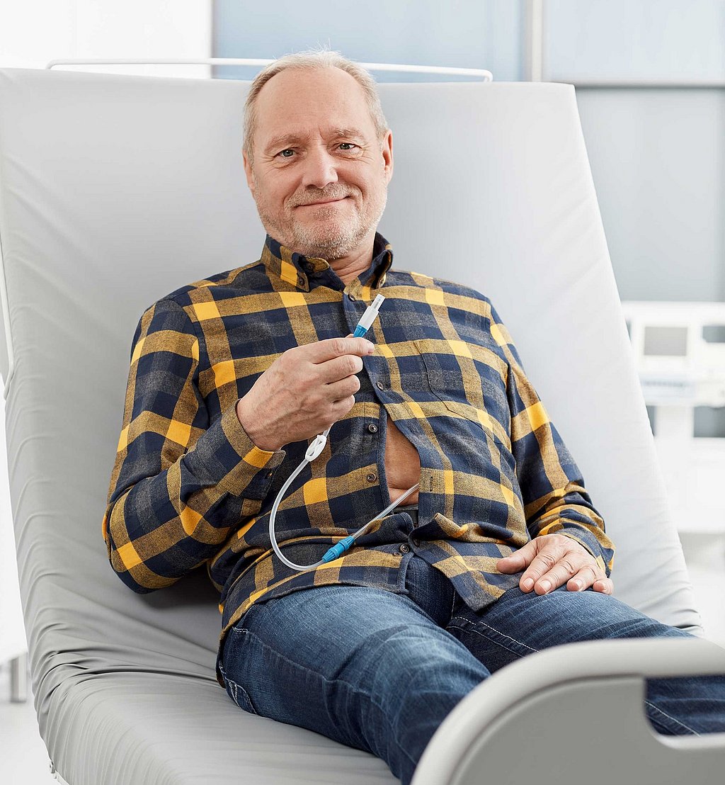 Es ist sehr wichtig, dass Sie die Katheteraustrittsstelle vor jeder Dialysebehandlung gemäss den Anweisungen Ihres Dialyseteams desinfizieren und verbinden. Halten Sie sich beim Anschliessen und Abklemmen des Dialysekatheters strikt an die Anweisungen des Dialyseteams. Stellen Sie ausserdem sicher, dass Ihr Katheter im Alltag so gut wie möglich geschützt ist (bei persönlicher Hygiene, Hausarbeit oder Gartenarbeit).