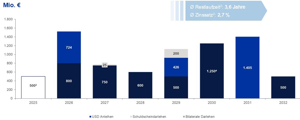 Wir stellen unsere finanzielle Flexibilität durch den Erhalt ausreichender Liquidität sicher. Unsere Refinanzierungsrisiken begrenzen wir durch ein ausgewogenes Fälligkeitsprofil, das durch eine breite Streuung der Laufzeiten bis zum Jahr 2031 gekennzeichnet ist. Unsere wesentlichen mittel- und langfristigen Finanzierungsinstrumente sind Anleihen in Euro und US-Dollar. Anleihen, die in Euro denominiert sind, werden über unser 10 MRD € Anleihen-Programm emittiert. Kurzfristiger Finanzierungsbedarf wird mittels Ausgaben im Rahmen des 1,5 MRD € Commercial Paper Programms in Euro und über bilaterale Kreditlinien abgedeckt. Die im Juli 2021 unterzeichnete Syndizierte Kreditlinie über 2 MRD € dient als zusätzliche Liquiditätsabsicherung.