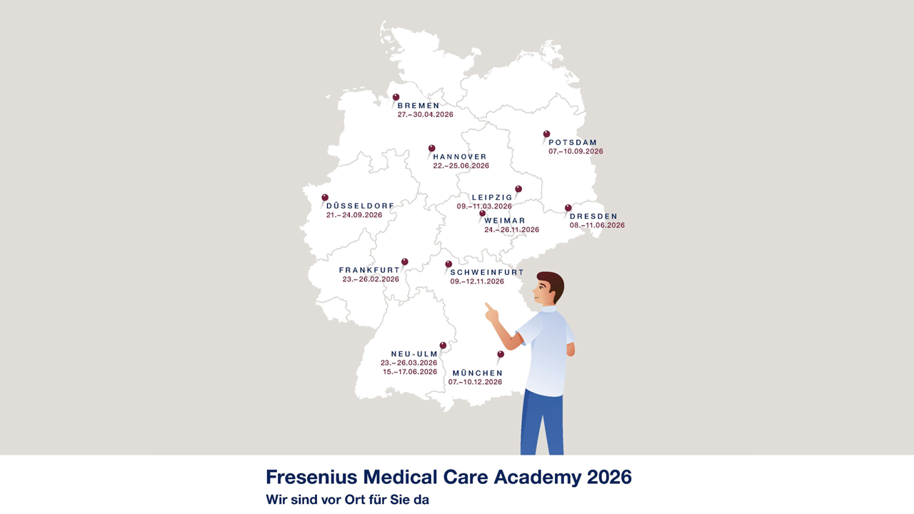 Mit unserer Fortbildungsreihe "Fresenius Medical Care Academy 2026" bieten wir Ihnen und Ihrem Team ein vielfältiges Programm an maßgeschneiderten Seminaren und Fortbildungen – praxisnah, aktuell und in Ihrer Nähe.
