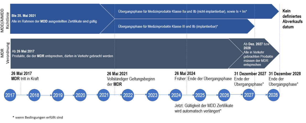 Bis Dezember 2027 bzw. Dezember 2028 (abhängig von der Klassifizierung des Medizinprodukts) können MDD-zertifizierte Produkte unter bestimmten Bedingungen nach der vollständigen Anwendbarkeit der MDR dennoch in Verkehr gebracht werden, solange ihre EG-Bescheinigungen noch gültig sind.