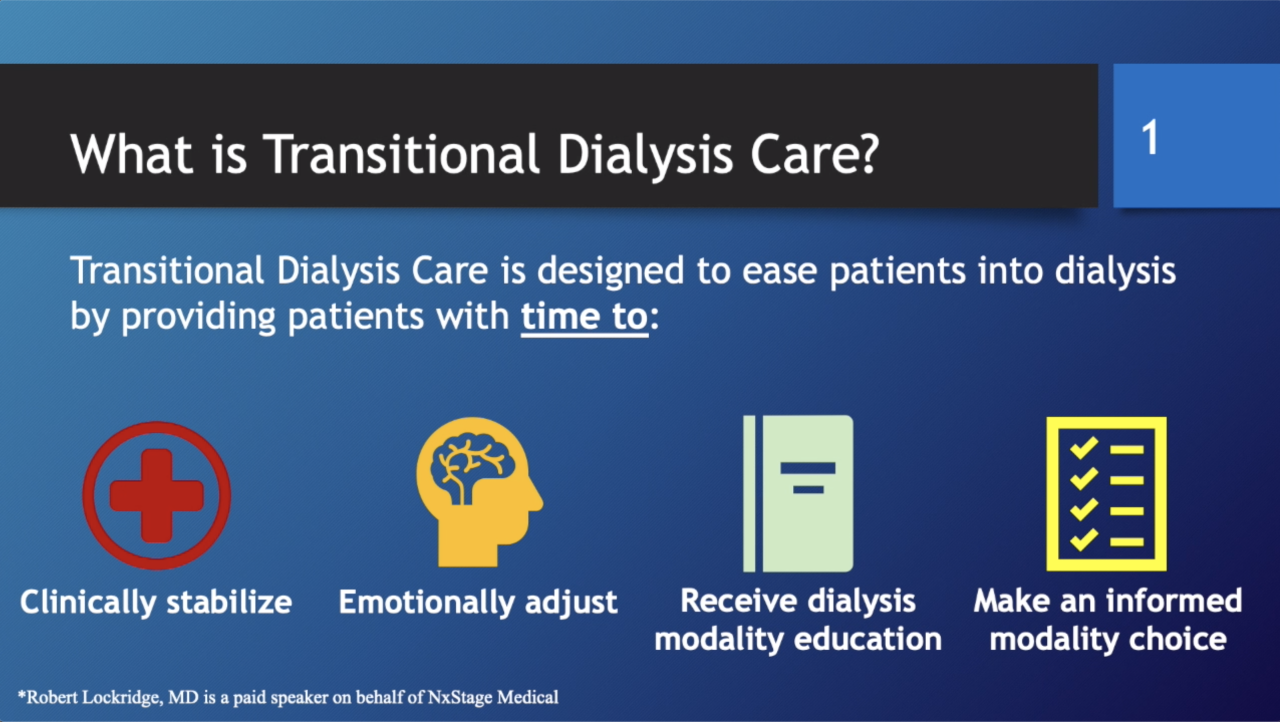 Easing patients into hemodialysis and educating them on their modality choices can help them make informed decisions, that meet their clinical and quality of life goals. Using existing center staff and infrastructure, transitional care provides the opportunity of expanding home hemodialysis (HHD), in-center hemodialysis (ICHD), and peritoneal dialysis (PD) programs.1