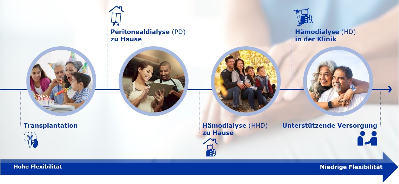 Es ist unser Ziel, jedem Patienten die richtige Behandlung zur richtigen Zeit und in der bevorzugten Umgebung zu bieten. Mehr über die verschiedenen Behandlungsmöglichkeiten der Dialyse erfahren Sie auch hier